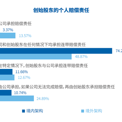 汉坤律师事务所基于 2021 年度交割的 650 个 VC/PE 项目的数据,发现:(1) 如果拿人民币基金,创始人 96% 以上概率要承担连带责任;(2) 如果走境外资金结构,创始人 86% 以上概率要承担连带责任。