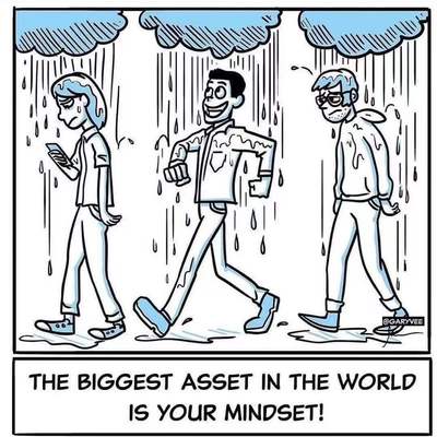 赞同图一中间那位的做法;其也认识到外部环境处于风雨中,但自己仍然可以越走越好。