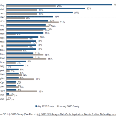 投资银行 Credit Suisse 分别在 2020年1月和7月针对 75 家全球性企业的 CIO(收入大于 10 亿美元)的一项调研中,问及未来三年内最有可能削减成本在哪些领域 ?