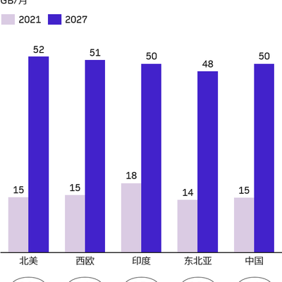 GSMA 认为当前到 2027 年,智能手机采用率和视频观看量将保持上升趋势,推动大部分地区的移动数据流量增长三倍以上。