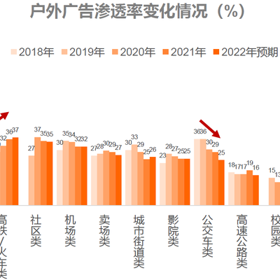 高铁/火车类户外广告呈现连续增长态势,2021年渗透率超过社区类和 机场类。而公交车类户外广告则连续走低。