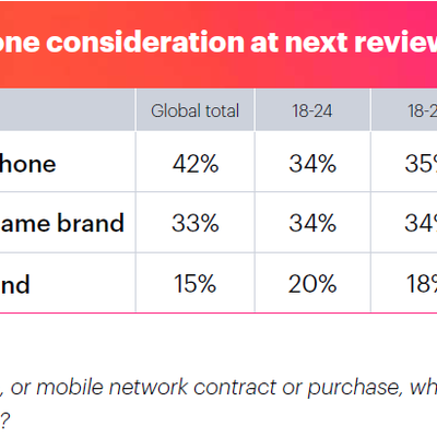 YouGov 针对全球 18 个国家和地区的 2022 消费者调研,围绕 “下一部手机,或者带移动套餐合约的手机”,42% 的调研对象选择继续持有当前手机,33% 选择同一品牌升级到新型号,只有 15% 会更改手机品牌。