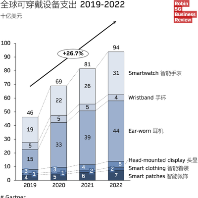Gartner 的一项研究估算了全球可穿戴设备的市场支出空间。智能耳机和智能手表是最大的两个收入品类,分别可在 2022 年达到 442 亿美元和 313 亿美元。