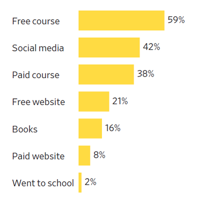 Oliver Wyman 咨询公司调研了美国蓝领工作者在职业节能方面的途径:免费的在线课程(59%)、社交媒体(42%)和付费课程(38%)是 Top 3 的位置。