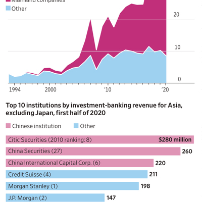 图2 是亚洲地区(除日本外)各投资银行的在 2020H1 收入排名,括号里面标注了这些机构在十年前的排名,可以感觉到这十年发生的巨大变化。