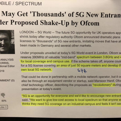 #5G# 英国通信监管机构 Ofcom CTO 最近的一个发言提出一个相当有创意的想法。把英国 3.8~4.2GHz 无线频谱资源,分配给上千个普通企业甚至个人(大约有390MHz 带宽)。