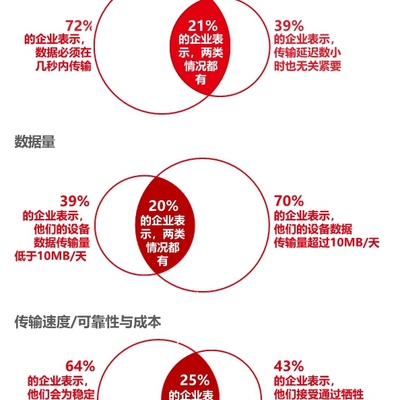 数据量:39% 企业表示其设备每天的数据传输量小于 10MB;而 70% 的企业的设备会超过 10MB/天。(两者存在重叠)