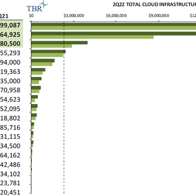 附图来自 TBR 咨询公司的数据跟踪,全球云基础设施和平台服务商收入排名 2022Q2。