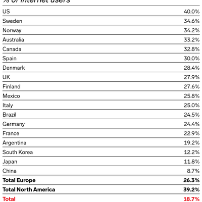 中国目前渗透率还处于低位 (8.7%),但增长势头不错。从 Robin 个人的观察看,过去一两年新增的高品质博客频道数量大增。
