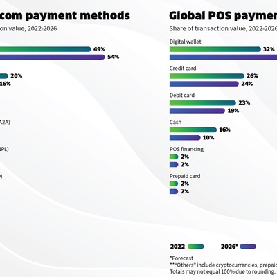 最直接的结论是:数字钱包的大幅崛起,尤其是现在 POS 在 2022-2026 增幅很大。信用卡和传统借记卡在全球角度看仍然有不小的比例。