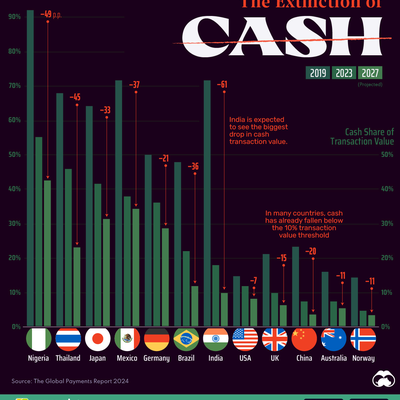 几乎所有国家的现金交易比例都在持续降低。移动支付等数字工具正在大幅分流现金纸币的角色。