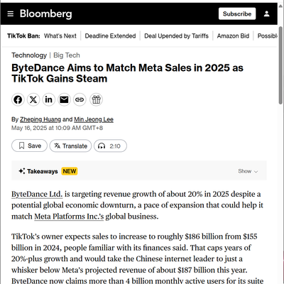 Bloomberg 报道,字节跳动将在 2025 年实现 1,860 亿美元的收入,同比 2024 年的 1,550 亿美元提升 20%。