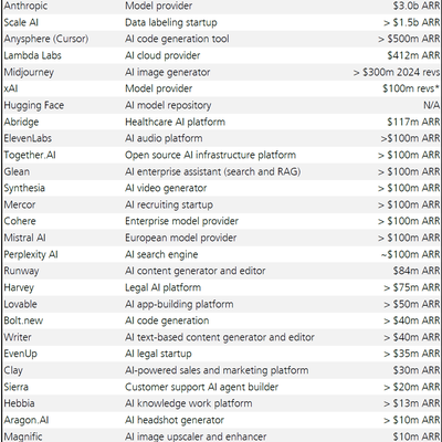 附图是 Rule of Thumb with Palle Broe 根据公开披露信息对 AI Agent 公司的排名,人均百万美金 ARR 的公司有八家,分别是:Cursor、Midjourney、Chai、Lovable、Gamma、OpenEvidence、HeyGen 和 Cognition AI。