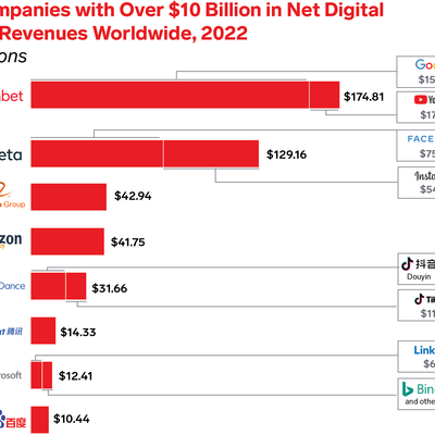 附图是 eMarketer 以 2022 年收入数据为例,展示了全球互联网广告收入 Top 8。从中可以看到一些有趣的点: