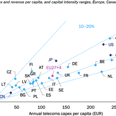 Analysys Mason 研究了欧盟 27 国和加拿大、中国、日本和美国的电信运营商收入(人均)和 CAPEX(人均)。