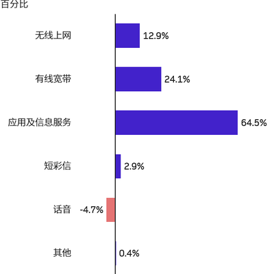 连接类业务(有限宽带、无线上网)增长了 206 亿,占新增比例的 37%。