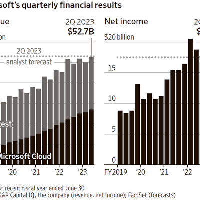 WSJ 绘制了微软公司 2019 财年至今的季度收入和净利润图表。