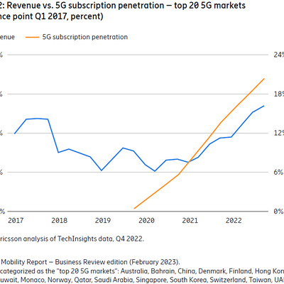 基于 Tech Insights 咨询公司的数据,爱立信研究发现,全球 5G 用户渗透率靠前的 Top 20 国家和地区的运营商收入提升和 5G 用户渗透率呈现了相关性。