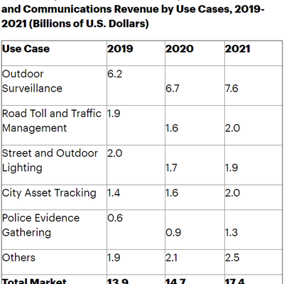 2020 年政府物联网市场最大的机会:户外监控、街道和户外照明、以及道路收费和交通管理。