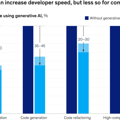 Mckinsey 研究显示,生成式 AI 在软件开发的不同环节带来的效率提升有较大差异。