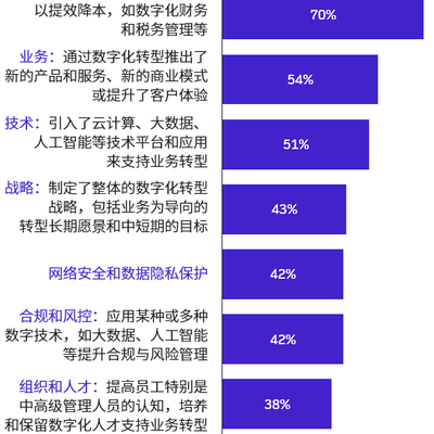 德勤对转型的工作内容给了一个比较详细的分类限定,选择管理转型的比例最高。比如,通过数字化加速财务管理效率。
