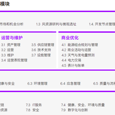Accenture 电力行业 HPUM(High Performance Utilities Model)模型,包括业务开发、工程与建设、运营与维护、商业优化、资产出售/退出、健康环境、企业服务七个模块。