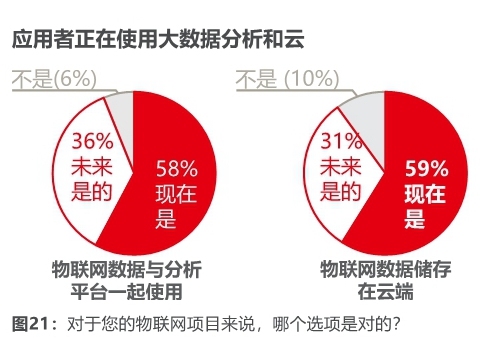 Vodafone 和 Analysys Mason 针对全球多个行业的 IoT 应用开发者调研表明:(1) 58% 的应用已经将 IoT 数据与分析平台在一起使用;(2) 59% 的 IoT 数据存储在云端。