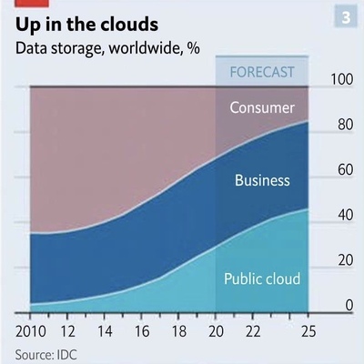 根据 IDC 的研究,未来几年会有更多数据存储在公有云之上,2025年有接近一半的数据总量会在云端。
