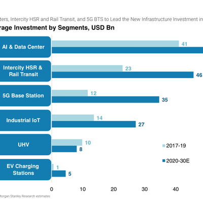 Morgan Stanley 估算了中国新基建(新型基础设施建设)的几个重点方向,在 2020~2030 的投资空间