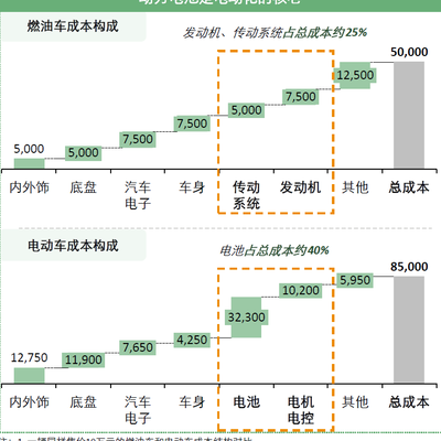 对比同样售价 10 万元的燃油车和电动车的成本结构:燃油车的核心环节是传动系统和发动机,占总成本的 25%;电动汽车的核心环节是动力电池和电机电控,占总成本的 40%。