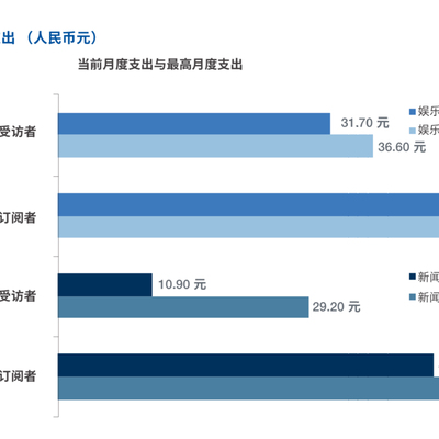 根据尼尔森的研究,中国消费者目前娱乐类支出和付费新闻类支出均为 ~45元/月。