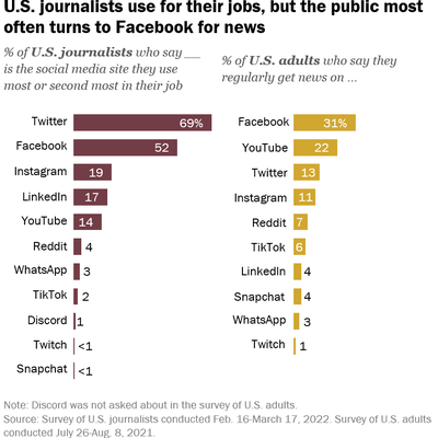 根据 Pew Research Center 的调研,如果你是一名美国记者,你最大的新闻来源是 Twitter,因为上面有最新的事件消息。