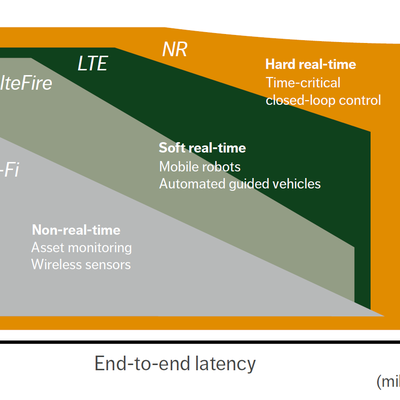 附图是爱立信对不同无线技术(和频率)在智能工厂的适用性研判Latency and reliability aspects of spectrum and technology choice.