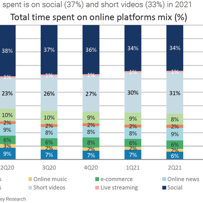 目前中国主要互联网平台中,用户使用时间最多是社交和短视频。