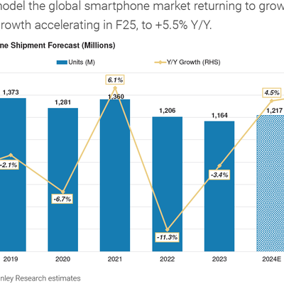 Morgan Stanley 预测 2024 年起全球智能手机出货量将重回上升通道,预计 2025 年可实现 12.8 亿部出货量。