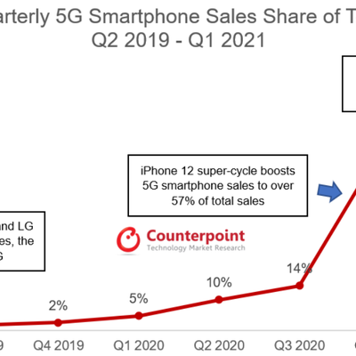 随着 iPhone 12 支持 5G 开始,这个比例被迅速提升到 57%。可见 iPhone 在整个美国移动通信市场的重大地位。