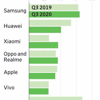 Counterpoint Research 针对全球智能机出货量 2020Q3 的排名。全球手机 Top 6 中,中国占据了四个品牌。