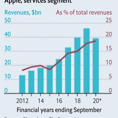 经济学人最近的数据展示,预计 Apple 近年服务类业务的收入贡献可以达到整体收入的 20%。对比而言,2012 年服务类收入占比仅为 10% 不到。