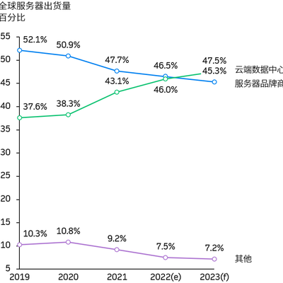 根据 DIGITIMES 的研究,预计 2023 年全球服务器出货量中,来自云端数据中心的占比将超过传统服务器品牌商侧。