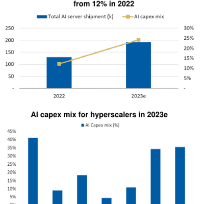 Morgan Stanley 预计全球科技类相关企业的 CAPEX 占比中 AI 相关的投资将从 2022 年的 12% 提升到 2023 年的 24%。