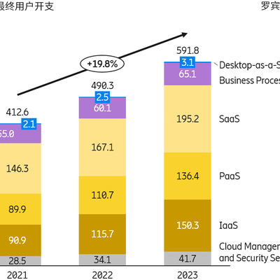 云管理和安全服务的开支也保持了高速增长,2023 年可达 417 亿美元。桌面云(Desktop-as-a-Service)的体量仍然还比较小(2023 年 31 亿美元)。