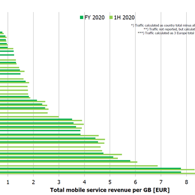 有大约 20% 的运营商每 GB 流量收入在 1 欧元以下,也有 10% 以上运营商在每 GB 流量 6~8 欧元以上。
