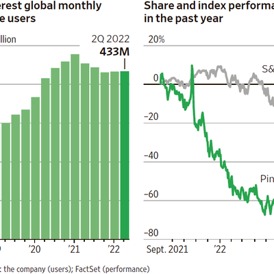 华尔街日版绘制了 Pinterest 近三年多的活跃用户数变化和股票的数据。