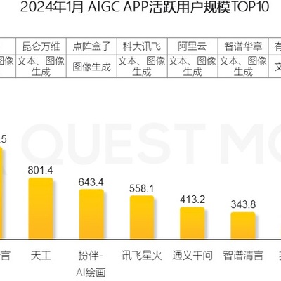 Quest Mobile 监测数据显示,字节跳动的豆包和百度的文心一言位居中国生成式 AI 活跃用户规模的前两位,分别为 1,760 万和 1,213 万户。