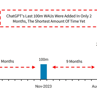 不过这个状态也在发生变化,以 ChatGPT 为例,其每周活跃用户数(WAU)正在快速提升。具体而言,1 亿WAU 用了 12 个月,而从 3 亿提升到 4 亿只用了两个月。