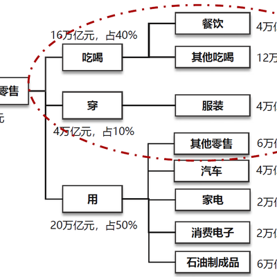 行业角度:餐饮是社零当中单一体量最大的行业集合。吃喝门类的社会消费品零售总额达到16万亿元,占社零总额约40%;其中餐饮4万亿元,占社零总额的约10%。其中30%为在家用餐,70%为在外用餐。