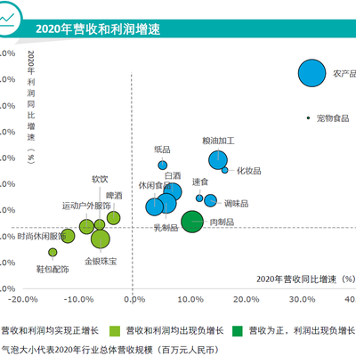 德勤咨询绘制了一张图,针对中国消费品和零售行业细分赛道的 2020 财务表现。横轴是营业收入的同比增幅,纵轴是利润的同比增幅。