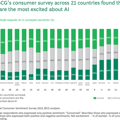 BCG 在 2023 年覆盖全球 21 个国家地区的调研显示,中国消费者对于 AI 的 “兴奋度” 最高。