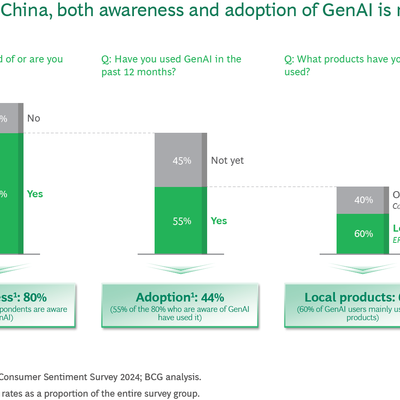 BCG 2024 年对中国消费者的调研显示,高达 80% 的受访者知晓生成式 AI。在知晓者中,又有 55% 的受访者使用过生成式 AI 的工具。