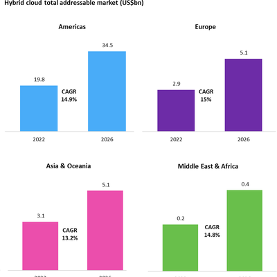 混合云的需求正在持续升温,OMDIA 预计 2022~2026 可保持 14.7% 的复合增长明预计到 2026 年全球市场空间可达 452 亿美元。